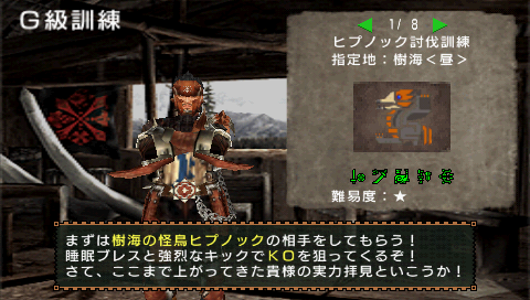 ついにG級訓練ラストです。しかもヒプノックです。いや~こりゃ楽勝楽勝…と思いきや結構返り討ちにあいました(笑) 気が抜けていたっていうのもあるとは思いますが、やっぱりイャンクックよりは強いですね。何回も飛び掛ってくる攻撃が結構うっとうしい。